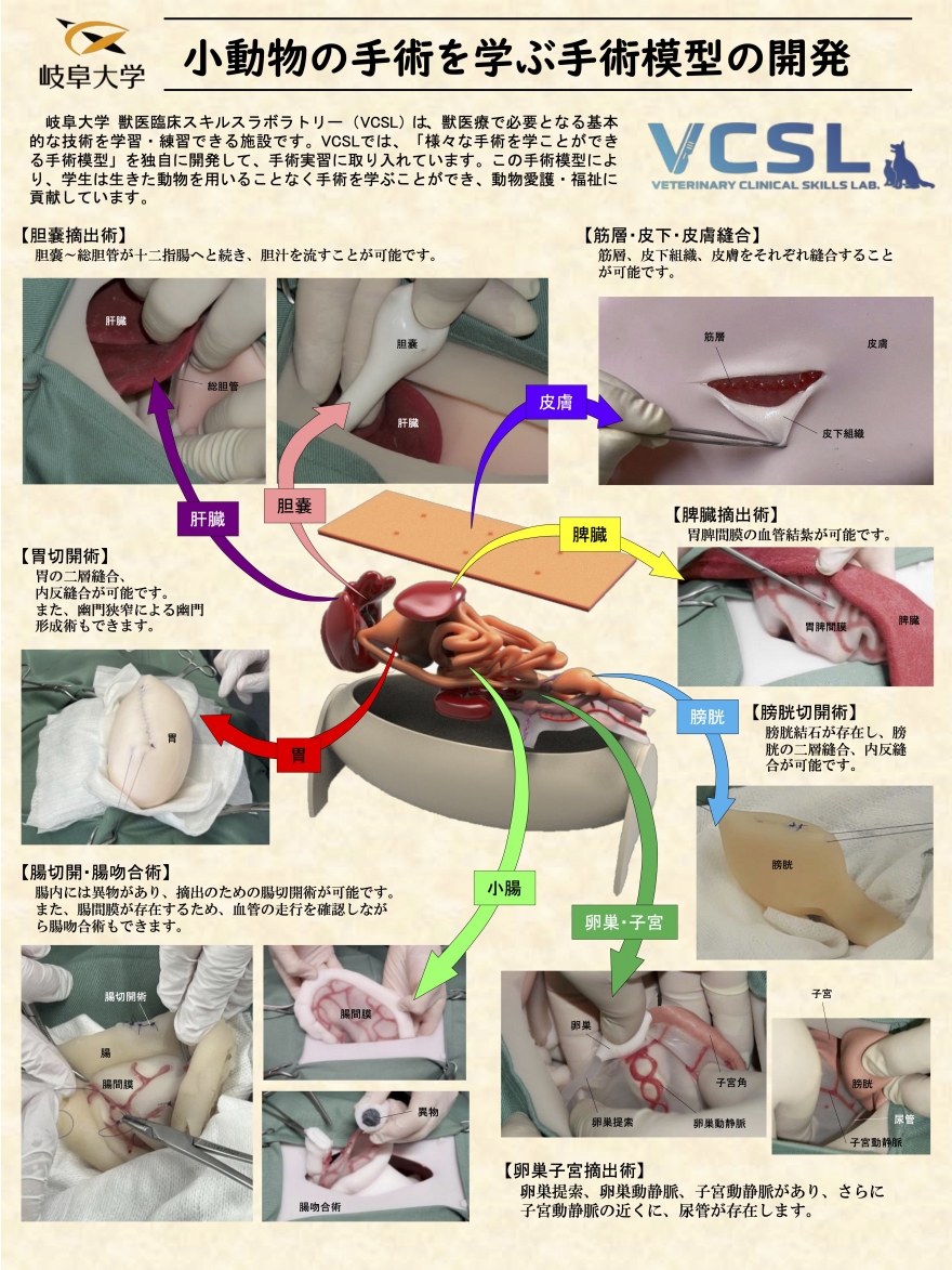 社会から期待される獣医療を実現するためには、獣医師として臨床スキルの習得が必要です。岐阜大学では2020年にスキルスラボを設置し、学生が自ら臨床スキルを身に付けられる環境を整えました。本学のスキルスラボで特に力を入れているのは、生きた動物を使用しない代替教育の推進です。既製品の導入に留まらず、産学連携を通じて、様々な臨床スキルに対応する代替教育法を開発しています。特に手術教育においては、独自に「手術模型」を開発しました。これは、卵型腹部ケースにシリコン製の肝臓、胆嚢と総胆管、食道と胃、脾臓と胃脾間膜、小腸と腸間膜、大腸、腎臓、尿管、膀胱と尿道、卵巣と子宮を配置し、臓器や血管の切開、縫合、結紮が可能で、使用後はシリコンを溶かしてもう一度、臓器模型に再生できる持続可能なシステムとなっております。このような手術模型を利用し、学生がいつでも何度でも基本的な手術技術を練習できる体制を確立しています。スキルスラボを教育および研究開発の中心として位置づけ、質の高い獣医学教育の実現を目指し、この取り組みを国内外に拡大していきます。