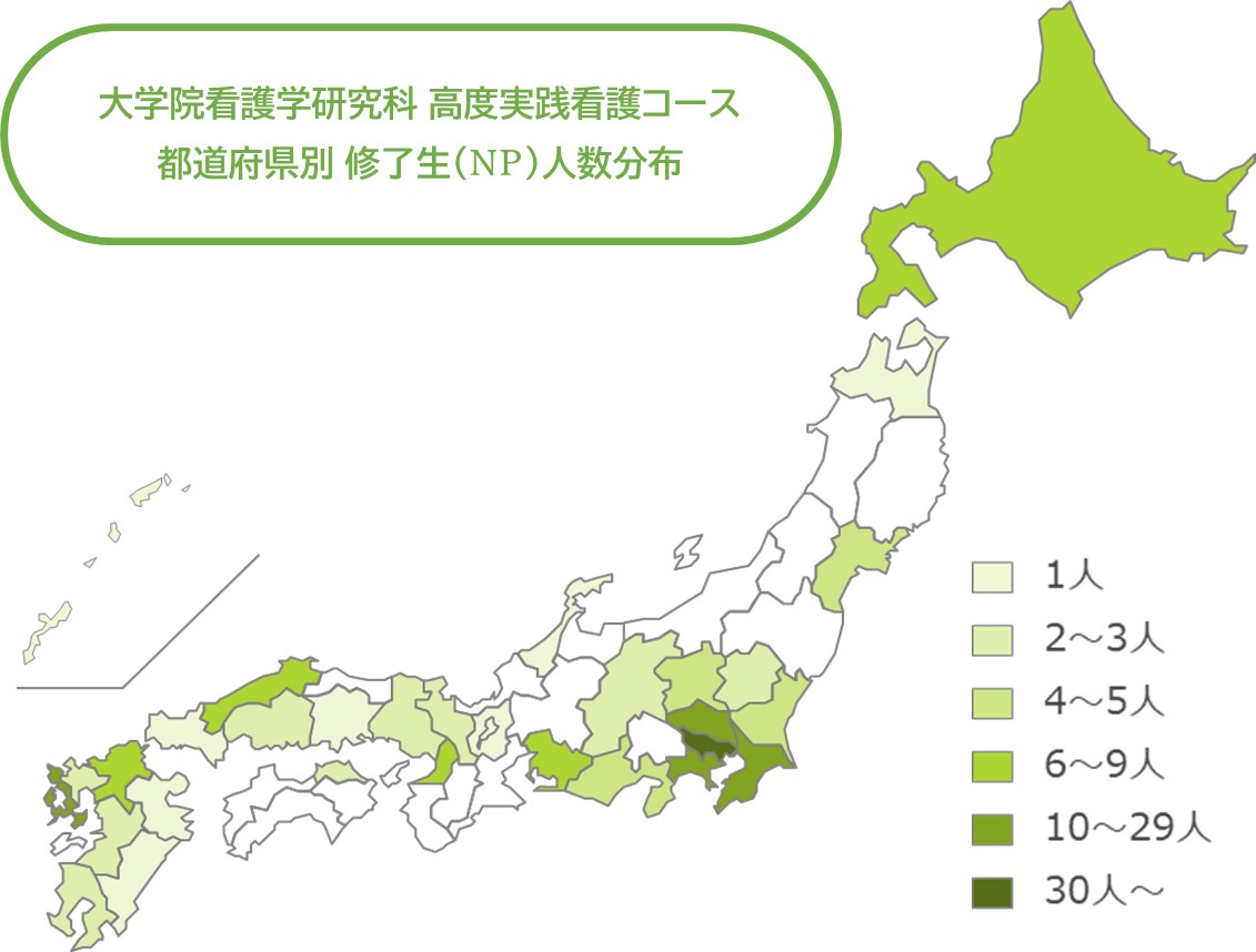- ・看護学研究科修士課程に高度実践看護コースを設け、医学の知識と初期医療に関する実践を修了した看護師である診療看護師(NP:Nurse Practitioner)の育成に取り組み、独立行政法人国立病院機構との連携体制を基盤に、修了生を診療看護師(NP)として全国の基幹病院に輩出している。