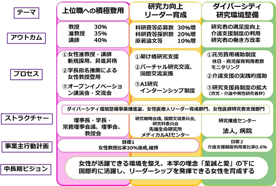 1900年に創設した本学は女性医療人の育成を使命としています。創設以来120年を超えて、時代に合わせて様々な取り組みをしてきました。女性医療人キャリア形成センターの設置のきっかけは、2007(平成19)年度文部科学省科学技術振興調整費「女性研究者モデル育成」事業「保育とワークシェアによる女性研究者支援」プロジェクトです。この取り組みでは院内保育所(やよい保育園)での病児保育の拡充と女性研究者の短時間勤務制度を確立しました。また復職支援の一環として2008(平成20)年度には「社会人の学び直しニーズ対応教育推進プログラム」委託事業により、医療従事者が生涯学習の一助として活用できる「教育・学習支援プログラム(e-ラーニング)」を開始し、さらに2016(平成28)年度には「女性医師キャリア支援モデル普及推進」委託事業により、卒業生のみでなく広く全国の女性医師に対する復職支援のノウハウを報告書にまとめ、「キャリア支援モデル」として全国展開しました。さらに2009(平成21)年度文部科学省「周産期医療環境整備事業(人材育成環境整備)」選定事業「男女共同参画型NICU人材養成プログラム-地域と支えあう周産期医療-」により、全国で初めてとなる学内ファミリ―サポート事業を開始しました。その後2016(平成28)年度文部科学省科学技術人材育成費補助事業「ダイバーシティ研究環境実現イニシアティブ(特色型)」、引き続いて2021(令和3)年度には同先端型に採択され、図に示すように上位職登用、研究力向上とリーダー育成、研究環境整備の3本柱で様々な取り組みを行っています。また看護職への就労継続支援として、キャリアコンサルタント有資格者やリエゾンナースによるカウンセリングや短時間勤務制度を実施している。さらに国外研修休職や進学休職、専門領域におけるスキルアップ研修、看護職の研究力向上支援など、就労継続支援のみならずキャリア形成も支援している。