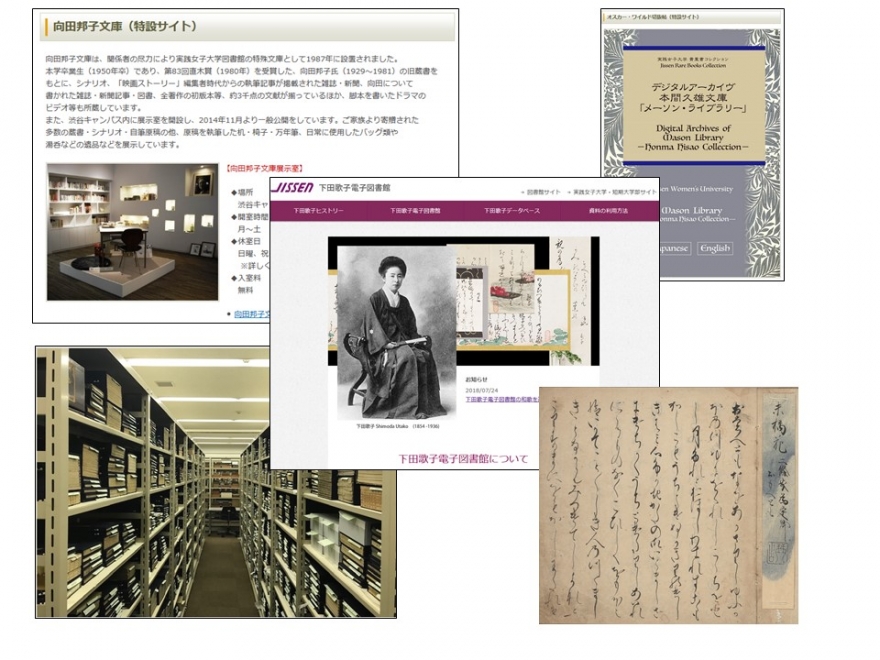 本学図書館は、教育研究のために多くの図書資料を収集するとともに、雑誌資料、電子資料などの収集、活用にも力をいれています。また、特殊コレクションとして、学祖の下田歌子に関する資料を有する下田歌子文庫、元学長山岸徳平博士の旧蔵書で、日本の古典籍6321点、漢籍751点を所蔵する山岸徳平文庫、黒川春村、黒川真頼、黒川真道の黒川家三代の旧蔵書からなる黒川文庫、本学名誉教授の本間久雄博士の旧蔵書を中心とした本間文庫など多彩なコレクションを有しています。これらの特殊コレクションを広く公開するために、データベースの構築にも力を注いできました。