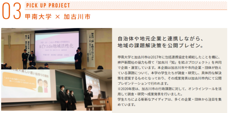 甲南大学は、地方自治体、コミュニティ、企業などと連携協定を結び、学・産・官が協力しあいながらの社会貢献活動を積極的に推進する中で、学生たちが参加できる地域活動のフィールドをますます拡充しています。また、本学では地域連携プロジェクトを教育研究活動と位置付け、「加古川『知』を結ぶプロジェクト」や「関西湾岸SDGsチャレンジ」などのほか、学生が地域を通じて主体的に学ぶプロジェクトを「地域プロジェクト科目」として単位認定し、学生の積極的な地域貢献活動を支援しています。