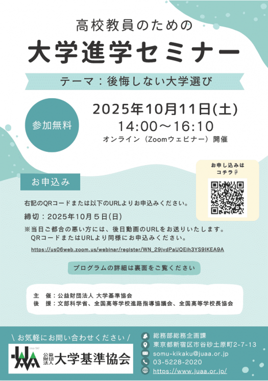 高校教員を対象とした「大学進学セミナー」を10月11日(土)14時より開催いたします(オンライン・Zoomウェビナー形式)。