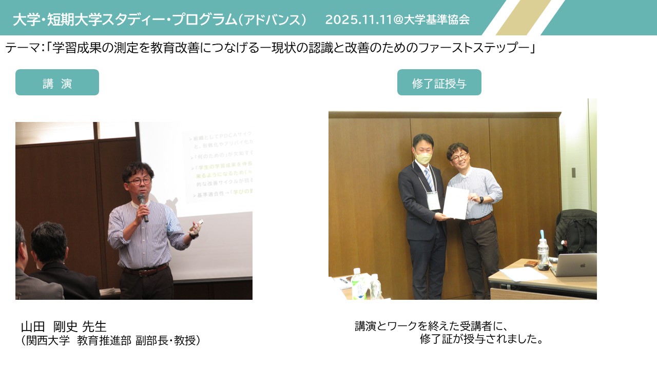 今年度のテーマ2(アドバンス:質保証活動の経験者向け)では、「学習成果の測定を教育改善につなげる―現状の認識と改善のためのファーストステップ―」と題し、11月11日(火)に対面形式で開催しました。