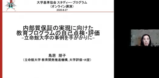 「内部質保証の基本的な意味・考え方と、学部・研究科レベルの点検・評価」と題した今回のテーマ1においては、本協会よりテーマに関する基本的事項の説明を行ったのち、立命館大学の鳥居朋子先生から、同大学における実践事例等のご講演を賜りました。