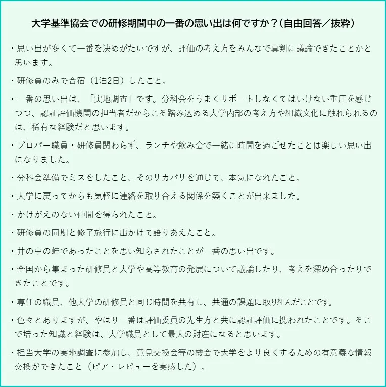 アンケートの最後には、研修期間中の一番の思い出をお聞きしました。分科会や実地調査といった認証評価実務に関する思い出のほか、評価者や他の研修員、本協会職員と認証評価や高等教育のあり方を議論したこと、同期の研修員とのランチや飲み会、旅行など、研修を通じて知り合った仲間との交流や研修生活の充実した日々を挙げられた方もいらっしゃいました。この自由記述欄では、実に様々な回答が寄せられ、皆さまがこの研修期間についてそれぞれに思い入れを抱かれているのだと知ることができ、本制度の意義を改めて考える良い機会となりました。