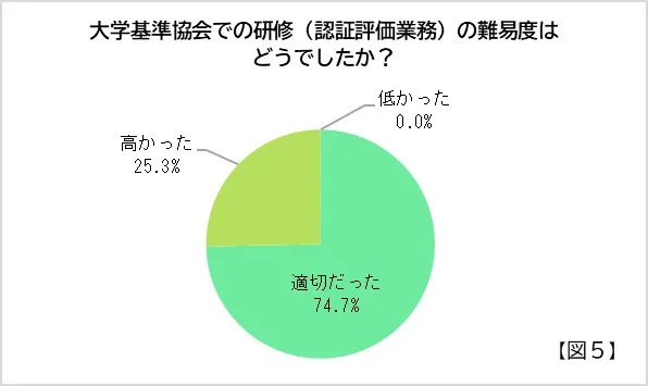 前述したとおり、研修期間中は、これまで経験したことのない認証評価の実務に携わることとなりますが、その難易度について、74.7%の方が「適切だった」、25.3%の方が「高かった」と回答され、「低かった」と回答された方はいませんでした(図5)。