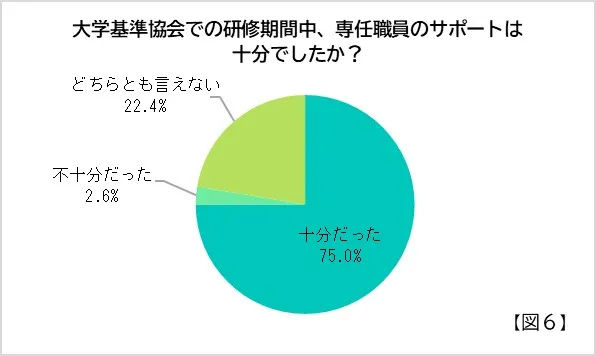 研修のメインである認証評価の実務にあたってはもちろんのこと、それ以外にも研修期間中の様々な場面において、専任職員によるサポート体制を整えるよう心掛けておりますが、そのサポートが十分であったか、という問いには、75.0%の方が「十分だった」、22.4%の方が「どちらとも言えない」、2.6%の方が「不十分だった」と回答されました(図6)。概ね満足はいただけているようですが、改善の余地も十分に残されていることがわかる結果でもありますので、研修員の皆さまがどのようなサポートを必要とされているかを理解し、さらに万全な形で研修に臨んでいただけるよう努めていきたいと思います。