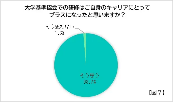 研修を修了された皆さまは、現在、認証評価の担当部署をはじめとした、所属大学のさまざまな部署でご活躍されています。本協会での研修が自身のキャリアとってプラスになったか、という質問には、実に98.7%の方が「そう思う」と回答され、本協会にとって大変嬉しい結果となりました(図7)。多くの皆さまに、本協会での経験をご自身のキャリアアップにつなげていただいているようです。