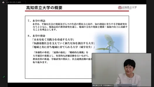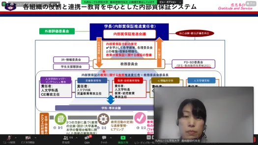 今回の事例報告は、数ある内部質保証の論点の中で、学習成果の取り扱いとの連関に焦点を当てて実施しました。このことについて順に、名城大学、九州ルーテル学院大学及び高知県立大学からそれぞれ報告があり、評価に向けた申請準備等についても実際の経験に基づく情報のご提供がありました。