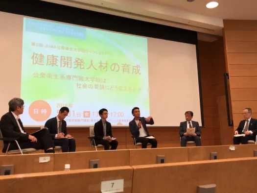 第2部では、「産業界と公衆衛生系専門職大学院との意見交換―公衆衛生系専門職大学院の教育の質をいかに向上させるべきか?」というテーマのもとで、企業関係者と5つの公衆衛生系専門職大学院の代表者によるパネルディスカッションを行いました。