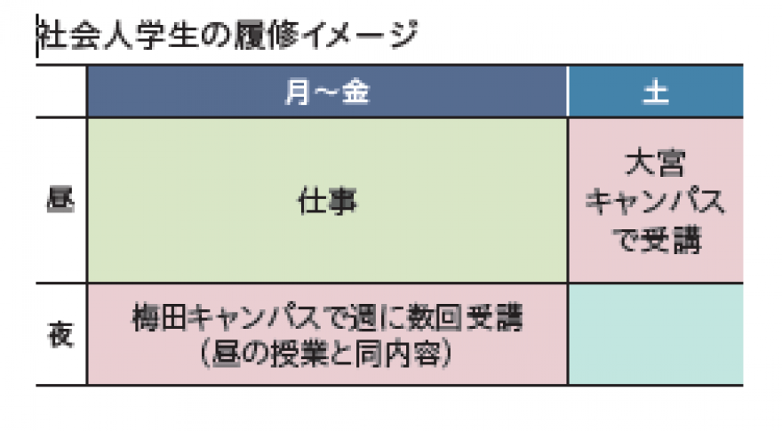 社会人の方の利便性を考慮して、平日(月~金)昼間の授業に加え、同内容の講義を夜間(6~7時限)にも開講しています。なお、土曜日はコア・デイとして、大宮キャンパスにてフルタイムで開講しています。仕事と修学の両立を図りながら、平日夜間と土曜日の受講のみで、教育課程を修了することが可能です。