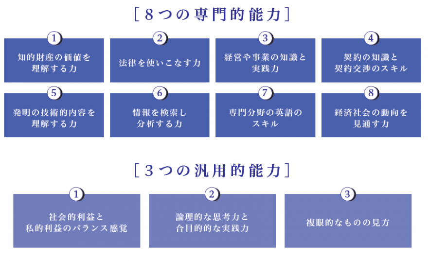 (2)知的財産学で修得する[ 8つの専門的能力]と[ 3つの汎用的能力]