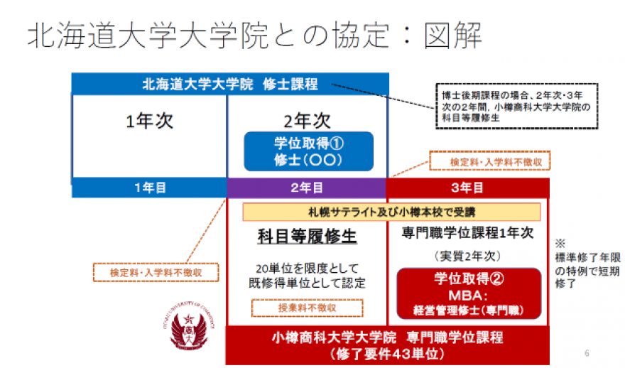 北海道大学との協定に基づく「MBA特別コース」は、北海道大学大学院の学生を本専攻の科目等履修生(実質1年次生)として受け入れ、北海道大学大学院の修了後、本専攻の1年次生(実質2年次生)として入学させる制度です。その際、科目等履修生時に履修した科目と、本専攻が指定する北海道大学大学院で取得した単位を既取得単位として認定することで、標準修業年限の短縮を図り、実質的に1年で本専攻を修了することができる仕組みとしています。この制度により、各々の専攻分野の深い専門知識を有しつつ組織マネジメントの実践能力を身につけた人材を育成し、早期に社会に輩出することを可能にしています。