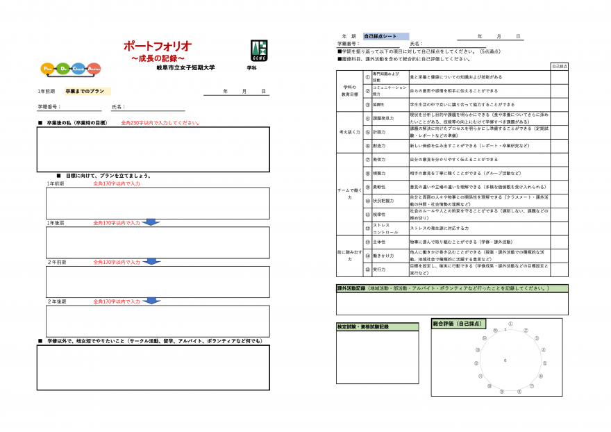 ・今後の展望としては、学修ポートフォリオを通じた教育の充実を進めると共に、「学修ポートフォリオ」と対になる取組みとして「教員ポートフォリオ」を策定し、教員個々が自ら授業内容をPDCAしていくための指針として令和6年度から実施しています。今後、その結果を見ながら、改善していく計画としています。