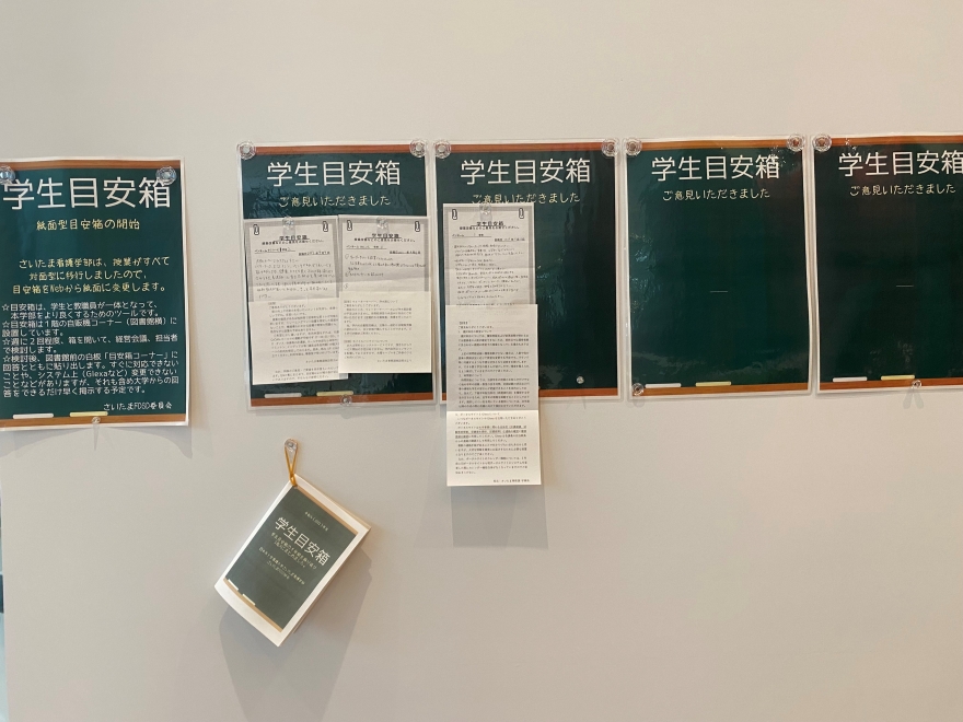 本学は、学生の意見を取り入れる方法の一つとして「目安箱」を活用している。授業に関する意見や要望は「授業改善アンケート」からも得るが、アンケートは授業終了後に行うため、すぐに授業の改善にはつなげることは難しい。そこで、速やかな対応につながるよう「目安箱」を設けた。「目安箱」は、学生と教職員が一体となって、本学をより良くするためのツールであること周知している。投書内容は多岐にわたり各担当部署が十分に検討するが、要望に応えられない場合は理由を書いて学生の理解を求め、学生が自立して学生生活を送れるような表現を心がけている。例えば、節電を承知しているが、ラウンジの電気は消さないでほしいという投書に、暗いと感じられた時は適宜点灯してください(設備係)と回答したり、教室移動が多く、次の授業への準備が間に合わないという投書には、記入時間を含めて正規時間内で終了するよう教員に伝えます(教務委員会)と回答したりしている。 この他、学生の意見を取り入れる方法として、学生と教職員との対面での意見交換会を定期的に設けている。学部生と大学院生とではニーズが異なるため別々に開催している。意見交換会で提示された要望により、講義室や院生室の利用方法の改善や、図書館開館時間の延長、次年度の時間割公表時期の早期化、教員や事務局からの情報配信方法の改善などがこれまでに実現された。意見交換会は、学生から要望を聞くだけでなく、教職員から要望に関連した事情を説明したり要望に応えられない理由がその場で伝えたりする機会でもあり、顔が見える状況で相互理解が促されている。意見交換会での要望とそれに対する教職員からの回答は文書にまとめられ、学部生あるいは大学院生に後日配信される。 図書館主催の「選書ツアー」は、学部生および大学院生に好評のイベントである。「選書ツアー」は年間図書購入予算に学生リクエスト枠を設け、年2回ほど希望者を募って大型書店に出かけて希望図書を購入するものである。学生は書店の本を手に取り、試し読みをして決め、学生が読みたい関心のある本が選ばれ、図書館の「選書コーナー」に並べられる。「選書ツアー」は、本学の図書が医学・看護系に偏りすぎず、また、学生が幅広い教養を身につける一助となっている。