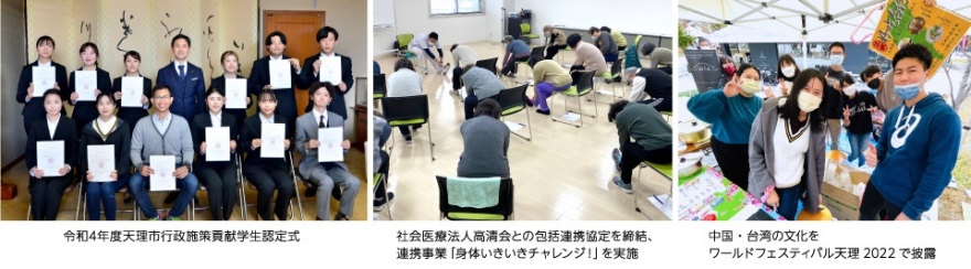- ・市との連携協定のもとで「天理市行政施策貢献学生認定制度」を創設し、市の施策や各種行事に自発的に参加し貢献した学生を「行政施策貢献学生」として認定している。