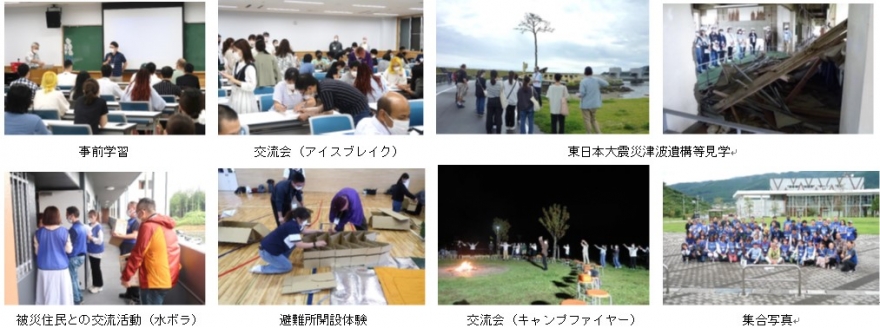 「水ボラ」は、東日本大震災復興支援活動の一環として、被災直後に岩手県に寄せられた支援物資の「ペットボトル飲料水」を、岩手県立大学盛岡短期大学部の教員が学生とともに仮設住宅等に配布したことに端を発するボランティア活動です。盛岡短期大学部が中心となり、飲料メーカーである(株)伊藤園の協力の下、東日本大震災津波の被災により仮設住宅又は災害公営住宅への転居を余儀なくされた地域住民に対し、世帯ごとに飲料水を配布することで会話のきっかけを作り、独居老人等への「声かけ」「見守り」を行うとともに、新たな地域コミュニティ形成の一助とすることを趣旨としています。岩手県陸前高田市を中心に毎月1回程度開催し、毎回10~30 人程度が参加しました。 こうしたボランティア活動に加えて、年1回「拡大水ボラ」として、米国オハイオ大学と共同で、愛知県中部大学留学中のオハイオ大学からの外国人留学生、飲料水及び寄付金の提供を受けている公益財団法人本庄国際奨学財団から、当該財団の奨学生である全国各地の大学院生、中部大学の日本人学生を加え、岩手県立大学でも全学的な取組へと活動を広げて、規模を拡大して実施しました。「拡大水ボラ」では、ペットボトル配布の他、大学間交流会をはじめとして、語り部による被災地学習、定住促進住宅、奇跡の一本松などの津波遺構見学、海岸清掃ボランティア活動などを実施しました。 新型コロナウイルス感染拡大による2年間の中断をはさんで、令和4(2022)年度からは、「被災地をフィールドとした防災学習及びボランティア活動を中心としたサービス・ラーニング」として位置付け、内容をボランティア活動中心から防災教育にシフトし、改めて関係大学及び財団との共同により、交流会はもとより、東日本大震災津波伝承館・津波遺構等の見学、避難所開設体験などを盛り込むなどして、復興防災学習プログラムとして実施しています。 こうした活動は、ボランティア活動体験にとどまらず、学生が多文化共生について考える機会ともなっており、教育的効果をもたらす取組として発展しているものととらえています。