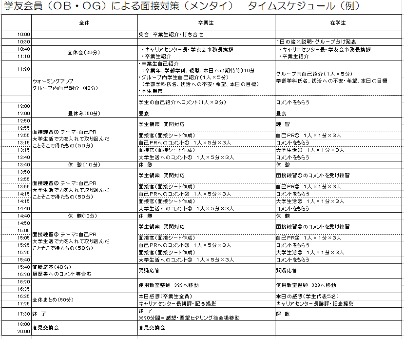 学生のキャリア発達と選択において、年代を越える「タテの繋がり」はロールモデルの効果が期待される。しかし同学年のみで「ヨコの関係」中心の学生生活を送る学生も散見されその対策としてスタートした。卒業生組織である学友会と相談しつつ在学生支援に協力くださるOB・OGを組織化し、コーチ役として担当頂いた。プログラム実施前にはOB・OGと事前ミーティングを開き、内容や進め方について意見交換を行うことでコーチ役のレベル合わせも行った。参加学生は事前に自己紹介シートを作成し、コーチ側もこれに目を通して実技に臨んだ。学生は卒業生との人間的ふれあいを通じ、親しみと同時に社会人視点を直接学ぶ機会となった。また副次的な成果であるが、異業種のOB・OG同士の交流も活発となり、卒業生自身のキャリアに対しても数々の発見や気づきの声が寄せられ、卒業後の支援機会ともなった。近年は感染症対策のためオンライン実施となっているが、企画趣旨からも対面での実施再開が望まれている(<別表1>参照)。