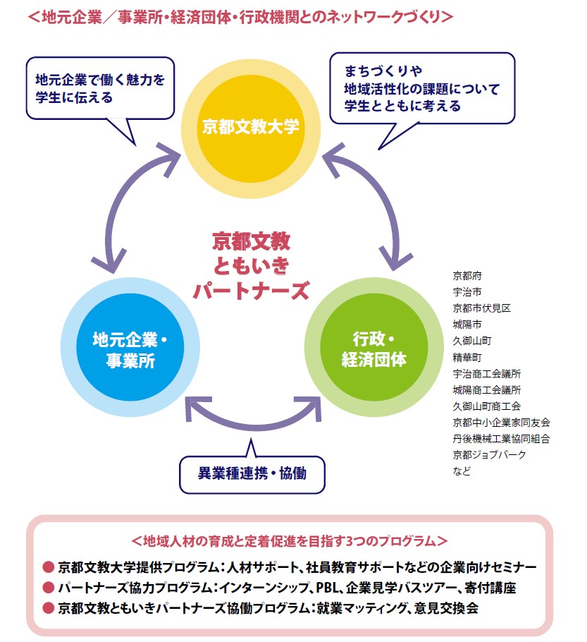 その後、2016年度に「地(知)の拠点大学による地方創生推進事業(COC+)」に参画。京都府南部地域での事業をさらに推進すべく、「京都文教ともいきパートナーズ」を立ち上げた。学生と地元企業や経済団体、行政との連携をより一層推進し、近隣の商工会議所(宇治、城陽、久御山)や京都中小企業家同友会などの経済団体と包括連携協定を締結。地域企業や自治体等でのインターンシップ、学生と企業関係者の交流会、学生と経済団体等との協働企画、地域課題の解決に取り組む「地域連携学生プロジェクト」等に取り組み、学内リソースを発展的に活用している。正課においても、宇治市、城陽市、久御山町、京丹後市などと連携したPBL授業を実施。附置機関の産業メンタルヘルス研究所の知見を活かし、「京都文教ともいきパートナーズ」に参加する事業所を対象とした「メンタルヘルス」に関する研修等も展開している。