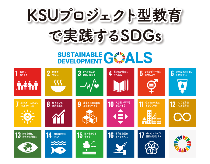 また、本学は、「持続可能な開発目標(SDGs)」の実現に向けた活動を、全学的な取り組みとして位置付け、さらに加速させるため、「学長宣言」を制定しており、「KSUプロジェクト型教育」においても、行動目標を定めて取り組みを強化し、SDGsの達成に貢献する次世代リーダーの育成に努めている。