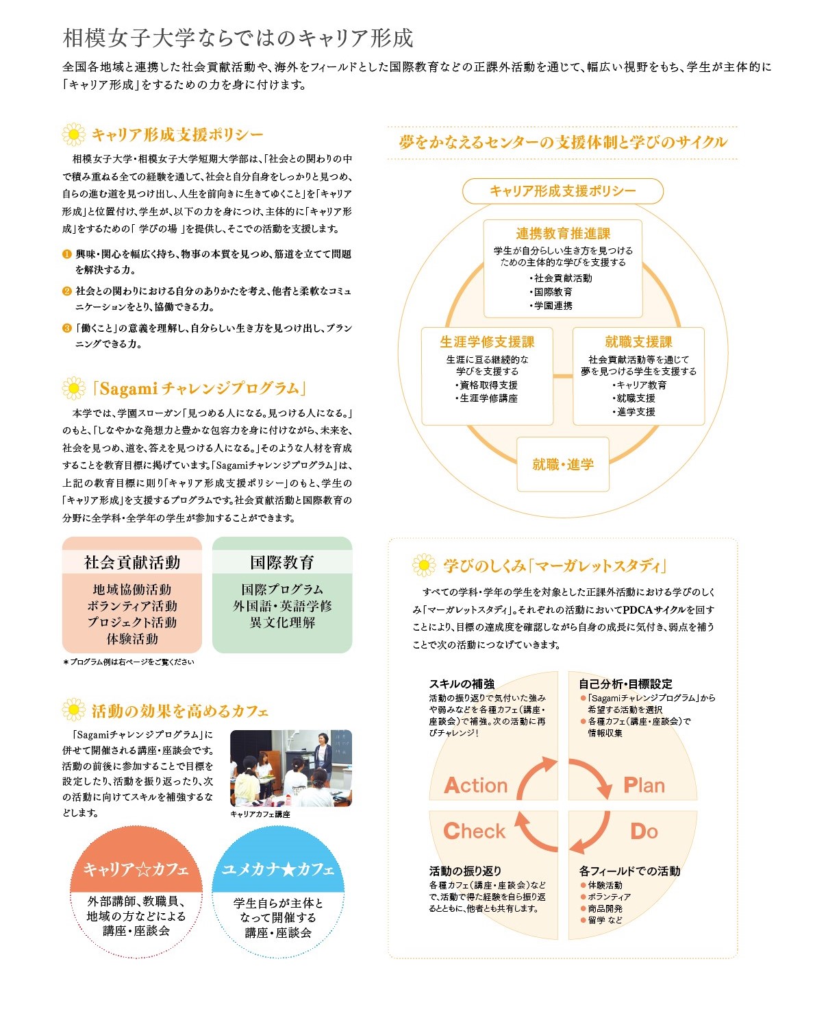 地域課題を解決すべく、従来の社会貢献活動を発展させ、「夢をかなえるセンター」を開設し、これまでの地域ボランティアや海外交流などの学生のキャリア形成と連動した活動を「Sagamiチャレンジプログラム」として取りまとめ、地域・企業との協働による伝統文化・食・農業などの多様な地域活性化に取り組んでいる。また、学生による活動参加前の自己分析・目標設定や参加後の振り返りのほか、卒業生・外部講師などのアドバイザーによる支援を組み込んだ「マーガレットスタディ」の学習方法を構築し、社会貢献による体験を通じた主体的なキャリア形成につなげるべく活動を深化させていることは評価できる。