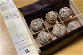本学におけるフェアトレード活動の中心は、学生たちによるフェアトレードサークルが担っています。消費を通じた身近な社会貢献として、本学大学生協でのフェアトレード産品販売、学内および学外での普及活動を積極的に行っています。2020年は、フェアトレード食材・自然素材のみを使用した国際フェアトレード認証スイーツ「さっぽろゆめ結晶(ブリスボール)」を独自に開発・販売する活動を行いました。この活動は、学生たちがクラウドファンディングによって活動資金を調達するところからスタートしており、多くの支援により実現することができました。