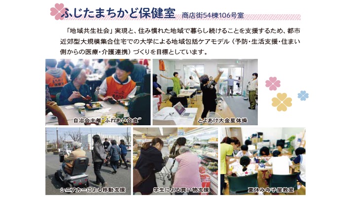 2014年に本学と豊明市は住民ニーズ調査し、2015年4月に「ふじたまちかど保健室」を設置し大学運営によりスタート。同時に本学学生と教職員が団地4階・5階空き室に居住しながら地域課題を共有し、課題解決支援する「学生居住おとなりプロジェクト」を開始しました。同時に団地周辺の地域課題共有と解決の場「けやきいきいきプロジェクト」を発足し、行政が中心となり、大学、UR、団地内自治会、団地診療所医師、民生委員、包括支援センター、社会福祉協議会、民間企業など20名以上が毎月定期会議を開催しています。