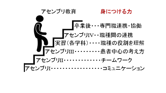アセンブリ教育において段階的に身につける力を下図に示します。アセンブリⅠでコミュニケーション、Ⅱでチームワーク、Ⅲで患者中心の考え方を身につけます。各学部における臨地・臨床実習で職種の役割を理解した上で、Ⅳで職種間の連携を身につけます。