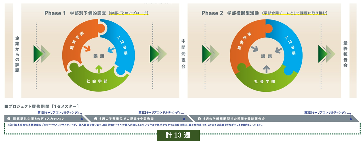 ・本学の教育の基本となっている少人数制ゼミナールは、一人ひとりの学びを深める点では非常に優れていますが、多様性という観点で見ると、同質的な集団を形成しやすく、様々な人間・文化がぶつかり合う実社会の中で対応していく能力を養うには十分とはいえない面がありました。この問題を解消する方策として生まれたのが、学部の垣根を越えた「学部横断型ゼミナール・プロジェクト」です。2008年度より正規科目として開講しており、2022年度現在の履修対象学年は、春学期2~4年次、秋学期は全学年です。