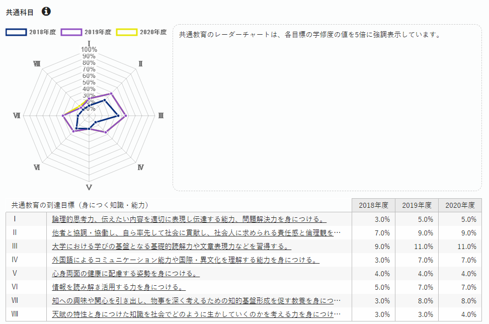 - ・学修ポートフォリオと教務システムを統合することより、学習成果の修得状況及び成績が「学修度」としてレーダーチャートで表示され、学生自らが学習成果を認識することができるようになっている。