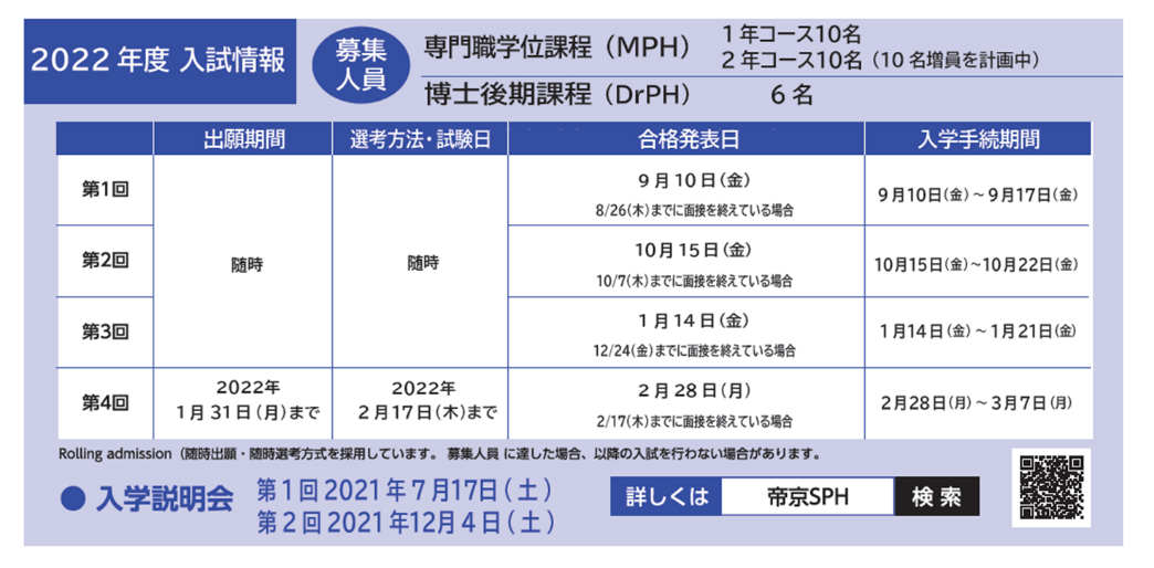 - ・出願期限を設けない「ローリング・アドミッション方式」を採用し、随時出願の受付及び入学者選抜を実施している。
