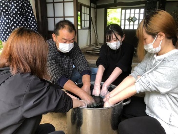 また、筑後地方の代表的な伝統産業の一つである久留米絣をテーマにした地域連携活動として、2015年度に法学部が開始し、医学部看護学科と共催してきた「絣フェスタ・プロジェクト」があります。同プロジェクトは、久留米絣のファッションショーをメインにしてきましたが、昨年度から地域の企業や農業関係者、久留米絣生産者等が立ち上げた「久留米絣未来プロジェクト」へ参画することで、久留米絣の天然染料の原料である藍草の植え付け・刈り取り、発酵、染め、久留米絣製品のデザイン・製品化まで体験するという新たな展開をみています。