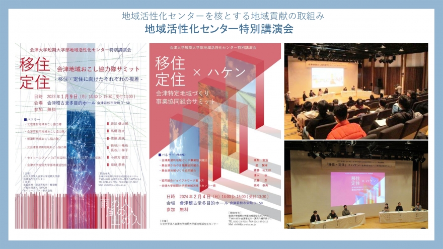 本学は開学以来、地域社会の経済文化の向上を設立使命とし、研究教育に加え、地域研究、公開講座による地域の生涯学習の充実を図るなど知識基盤社会の形成に努力してまいりました。平成18年に公立大学法人となり、平成19年には、福島県の地域資源を活かした地域活性化を積極的に展開していく組織として、会津大学短期大学部地域活性化センターを開設いたしました。東日本大震災とそれに伴う原子力災害からの復旧・復興が喫緊の課題となっていることから平成24年に「地域貢献に関する基本方針」を決定して本学の地域連携に向けた姿勢を明らかにするとともに、地域活性化センターを中心に、地域や地域団体と連携を図り、複雑・多様化する地域課題にこれまで以上に組織的かつ積極的に取り組んでいくことといたしました。