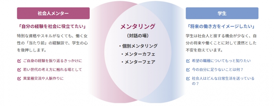 - ・学生の希望に沿った、多彩なライフスタイルを持つ社会人女性メンターのアドバイスを受けることができる。