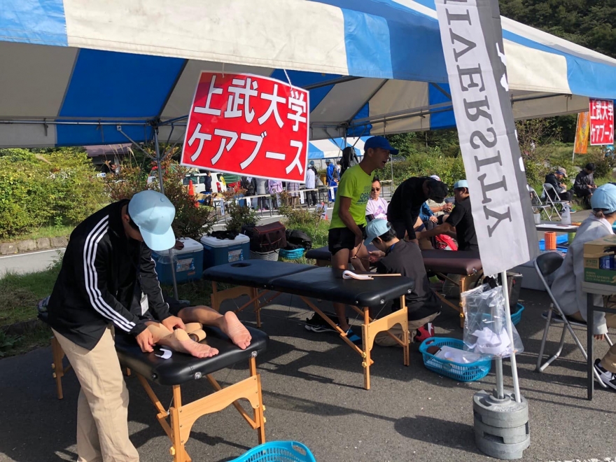 一方、スポーツ健康マネジメント学科柔道整復師コースは、目標の一つに「スポーツに強い柔道整復師の育成」を標榜していることもあって、平成26(2014)年度のコース開設と時を同じくしてスポーツトレーナー部のボランティア活動を開始した。部員のほとんどは柔道整復師を目指す学生である。近年では、マラソン、自転車競技、トライアスロンなど、群馬県内で開催される各大会に出向き、競技前のストレッチやテーピング、競技後のアイシング、マッサージ、セルフケアなど、様々な年齢層や競技レベルの参加者の要望に応じて、指導教員のもとで適切な処置を行っている。ケアブースを訪れた大会参加者に対するアンケート調査では、96%が「学生の態度が良い」と回答している。トレーナー部の活動は、参加者から高い評価を受けていると同時に、学生自身が職業意識を高め、将来求められる職能を向上させるべく意欲的に学修に取り組むことにつながっている。