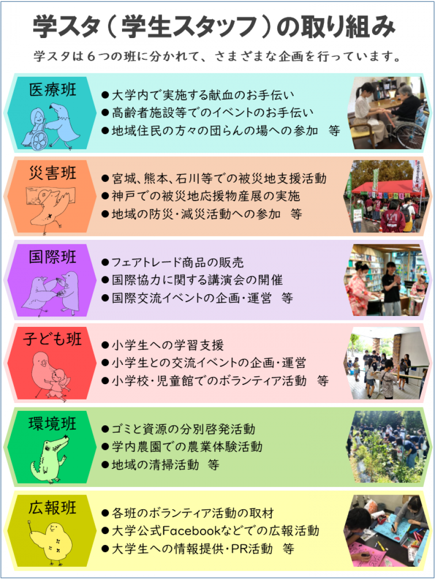- ・「ボランティア活動支援室」に所属する「学生スタッフ(学スタ)」が活動における企画・運営を自ら行い、マネジメント能力の醸成を図っている。