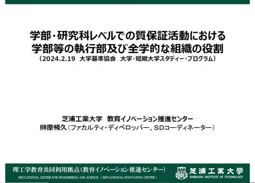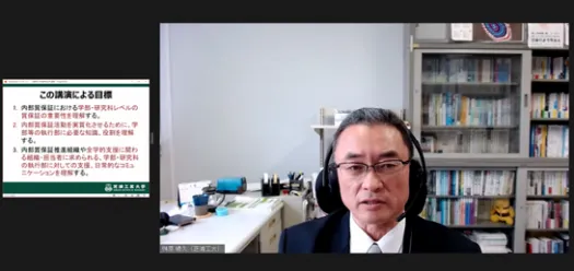 「学部・研究科レベルでの質保証活動における学部等の執行部及び全学的な組織の役割」と題した今回は、芝浦工業大学教育イノベーション推進センターの榊原暢久先生を講師にお招きし、講演とグループワークとで構成しました。今回も多くの参加があり、特にグループワークでは参加者それぞれの大学の課題等を出発点に講師とのやりとりが行われるなど、内部質保証に取り組む正会員校に有意義な研修の機会となることができました。