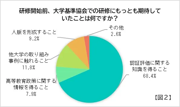 次に、本協会での研修が始まる前に期待していたことについてお聞きしたところ、やはり、「認証評価に関する知識を得ること」と回答された方が最も多く、68.4%となり、「他大学の取り組み事例に触れること」が11.8%、「人脈を形成すること」が9.2%、「高等教育政策に関する情報を得ること」が7.9%という結果になりました(図2)。