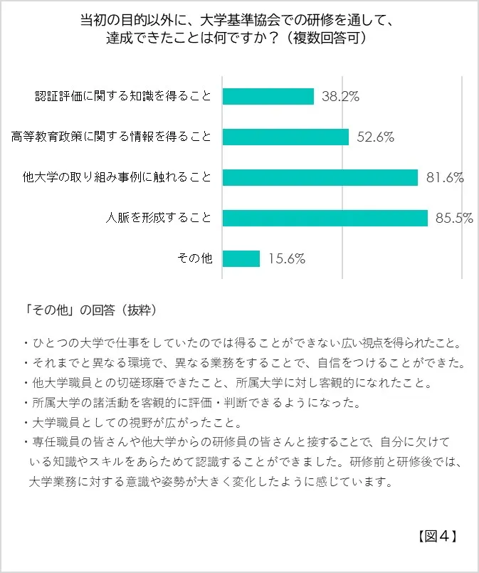 実際に研修を終えてみて、当初の目的以外に達成できたことについてもお聞きしました(複数回答可)。こちらで用意した選択肢の中では、「人脈を形成すること」が85.5%、「他大学の取り組み事例に触れること」が81.6%、「高等教育政策に関する情報を得ること」が52.6%、「認証評価に関する知識を得ること」が38.2%という結果となったほか、「異なる環境で働くことで視野が広がった」「自信がついた」といった旨の自由回答もありました(図4)。