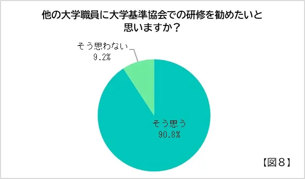 では、研修修了者として、自分以外の他の大学職員にも本協会での研修を勧めたいと思うか、という質問については、90.8%の方が「そう思う」、9.2%の方が「そう思わない」と回答されました(図8)。自身のキャリアアップに繋がると感じられる研修であるとはいえ、本務校を1年間離れることになること等、それなりに研修へのハードルがあることも、この結果の要因のひとつかもしれません。